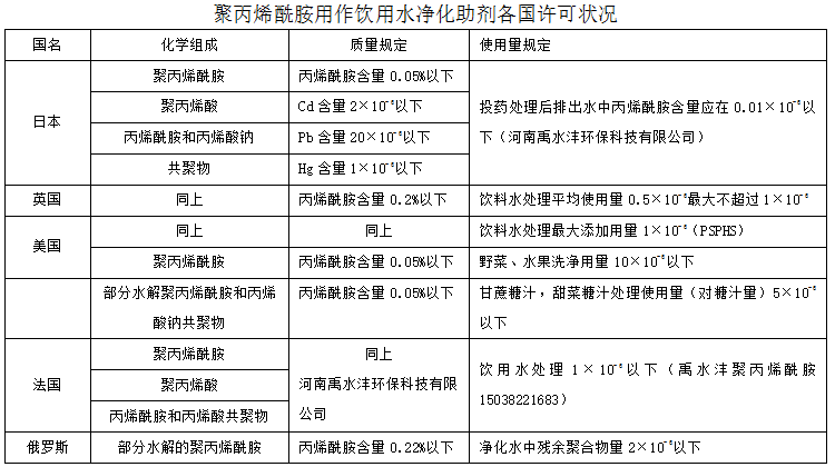 许多聚丙烯酰胺产品已被美国环境保护局和食品、药品管理局批准可用为饮用水处理、糖汁澄清的水果、蔬菜洗涤等。但是,应用的最大剂量是有限制的。丙烯酰胺在聚合物中残余量应小于0.05%。
